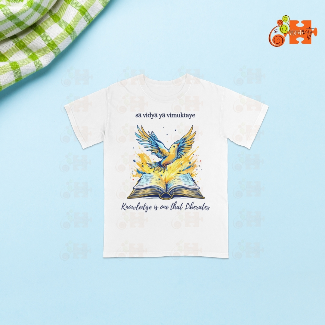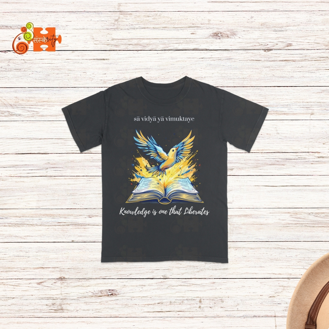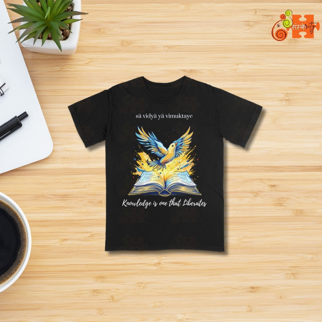 - Meaningful Design: Featuring a vibrant illustration of a bird taking flight from an open book, this T-shirt visually represents the liberating power of knowledge. The Sanskrit inscription “sā vidyā yā vimuktaye” adds an authentic touch of Indian heritage.