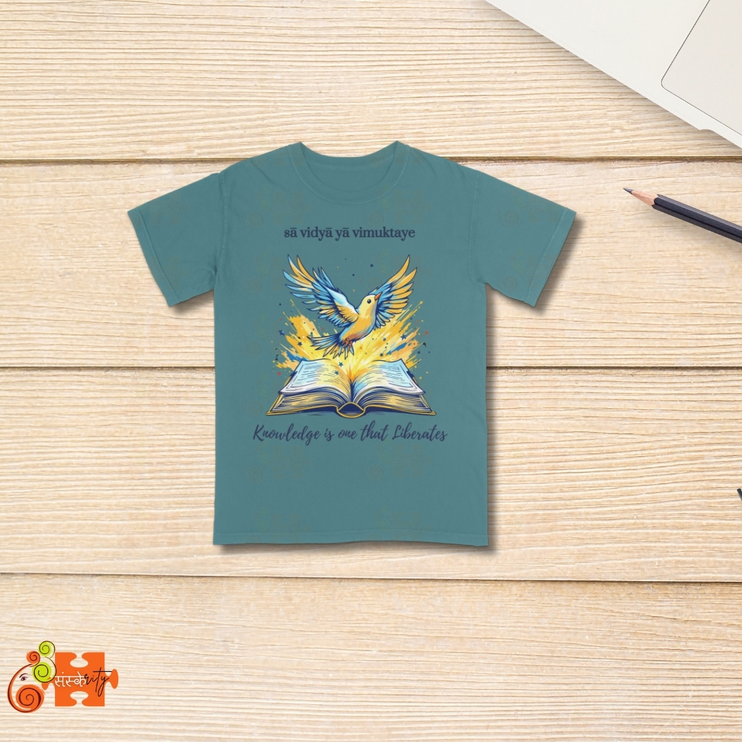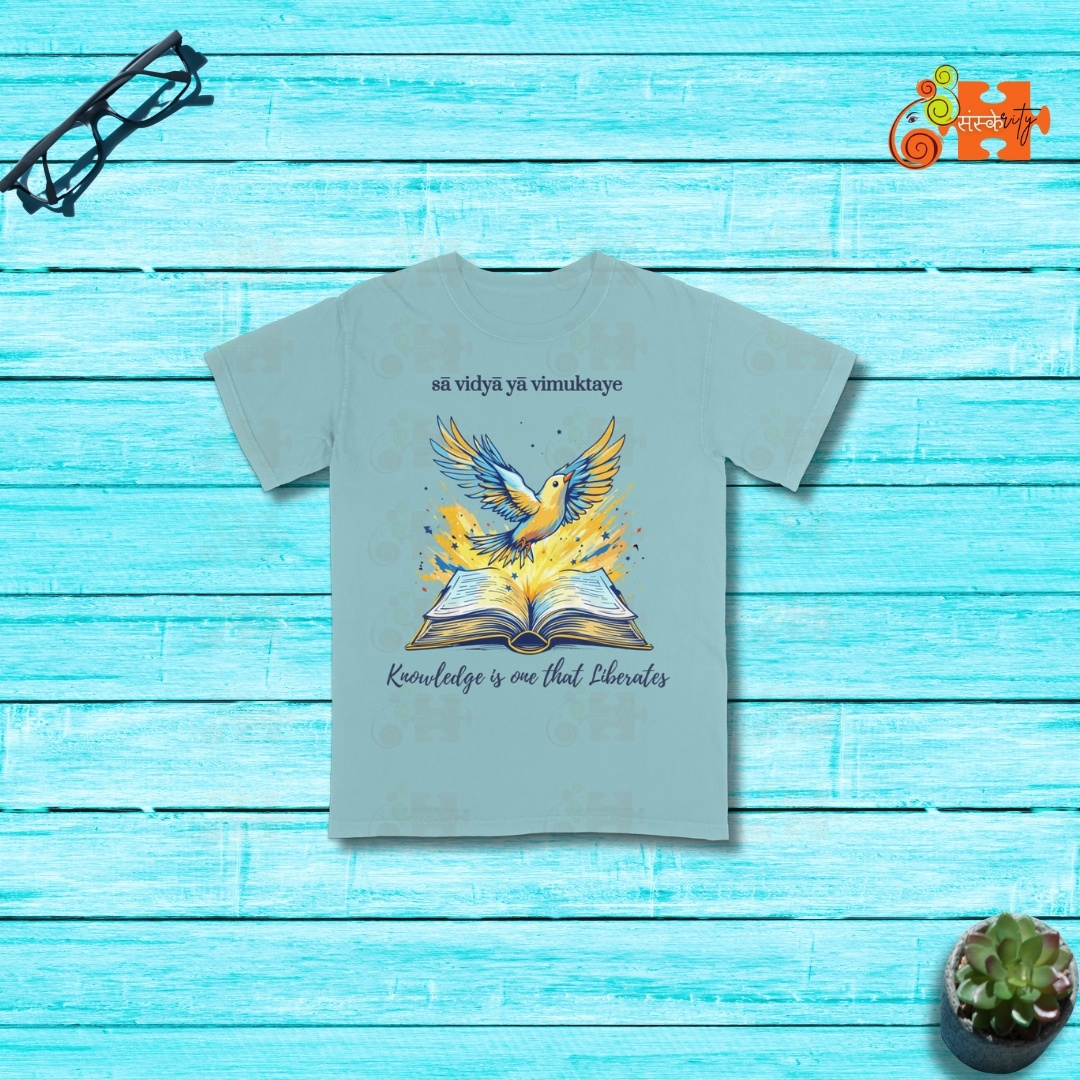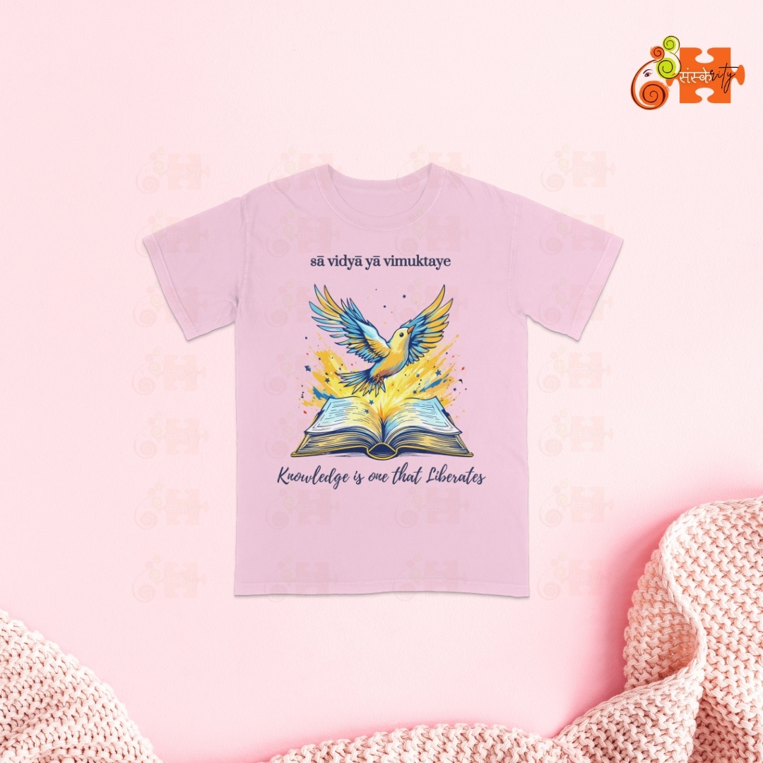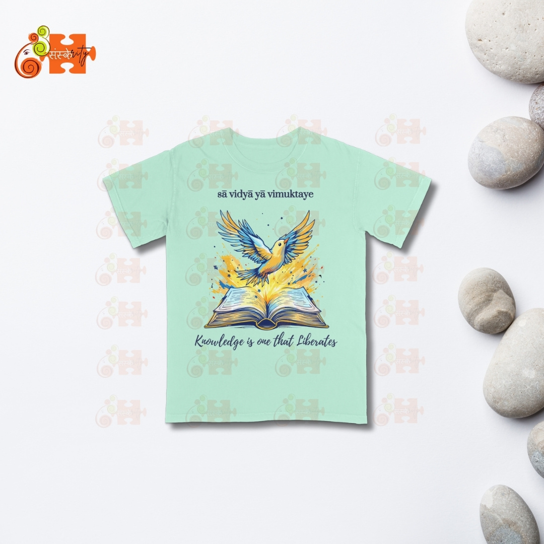 - Meaningful Design: Featuring a vibrant illustration of a bird taking flight from an open book, this T-shirt visually represents the liberating power of knowledge. The Sanskrit inscription “sā vidyā yā vimuktaye” adds an authentic touch of Indian heritage.