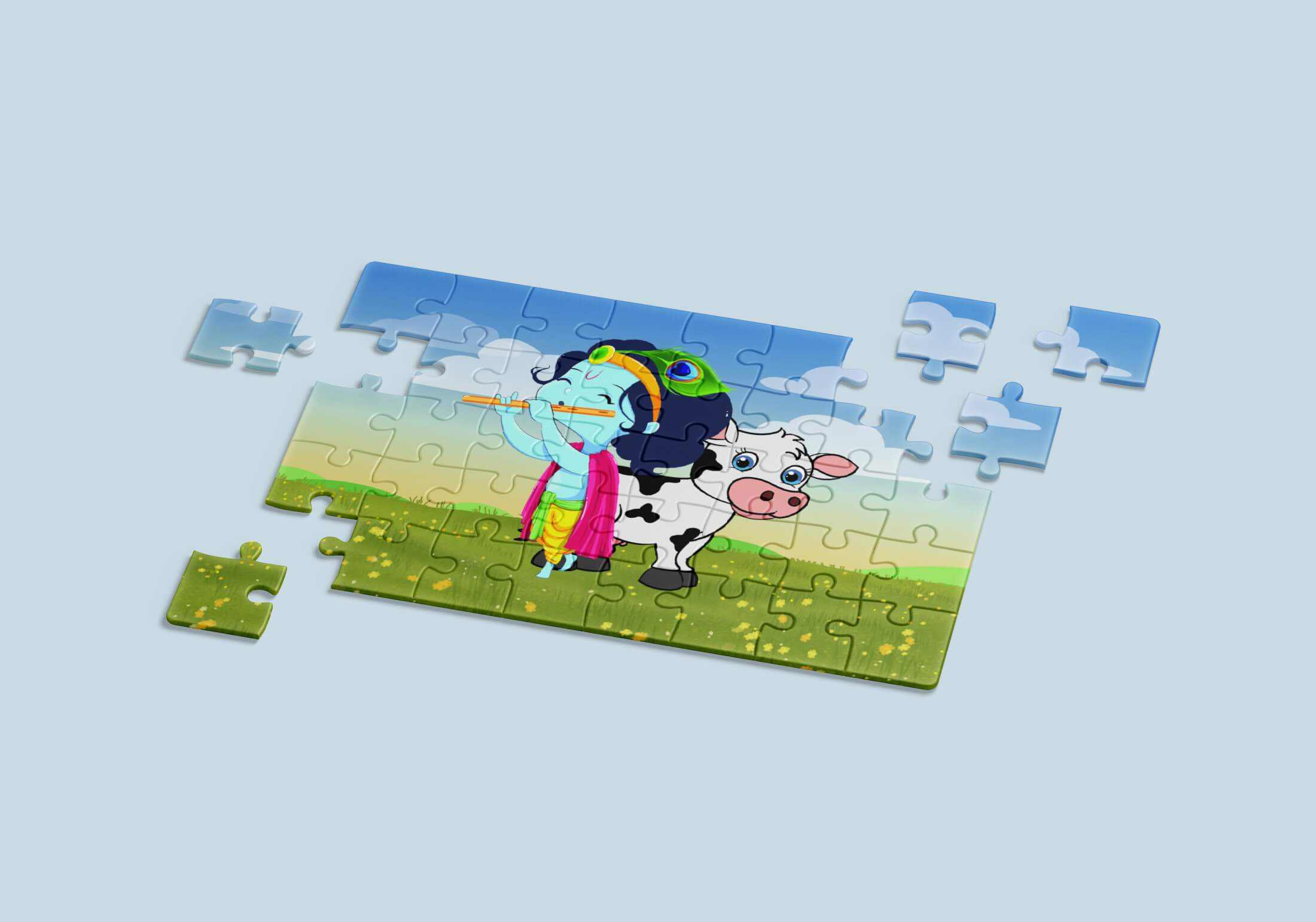 Step into the enchanting world of Krishna the Cowherd with our unique jigsaw puzzle! Piece together the scene of Krishna tending to his beloved calf, playing his magical flute by the country side. Spark your child’s imagination as they piece together this delightful puzzle, discovering the timeless charm of Krishna’s tales